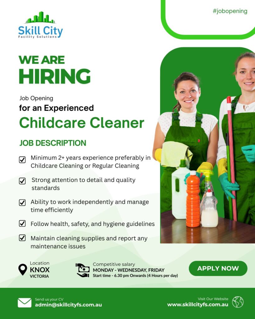 A leading childcare facility in Knox is seeking an experienced and dedicated Childcare Cleaner to help maintain safe, spotless, and hygienic environments for children and staff. This part-time role focuses on ensuring all indoor and outdoor areas meet high cleaning and disinfecting standards according to regulatory guidelines.
