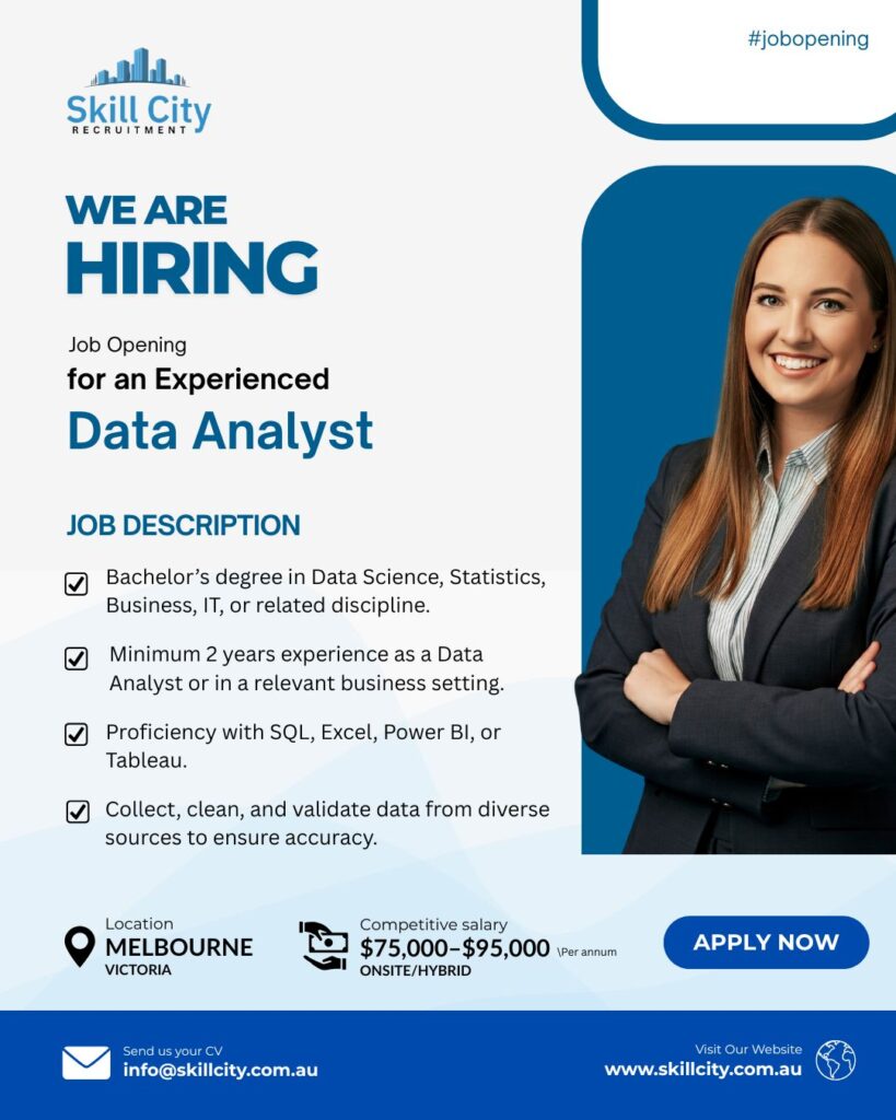 A reputable organisation in Melbourne is seeking a skilled Data Analyst to join their team. The role involves collecting, processing, and analysing data to provide actionable business insights, supporting strategic decisions, and operational improvements.