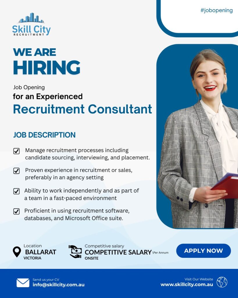A reputable recruitment agency in Ballarat is seeking a motivated and client-focused Recruitment Consultant to join their team. This role involves sourcing, screening, and placing top talent for a diverse range of clients while delivering excellent service and building strong relationships.